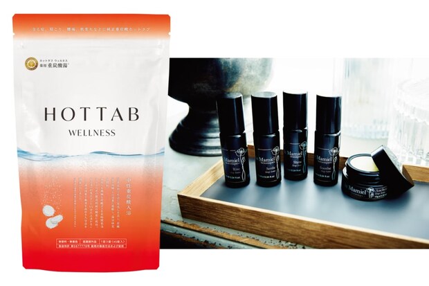 左:HOT TAB WELLNESS 45錠 ¥3,960(ホットタブ)、右:計5種のオイル&バームをラインナップ。ナイト&デイ オイル シリーズ オイル 10mL ¥8,360~、バーム 10g ¥9,350(全てデ・マミエール)