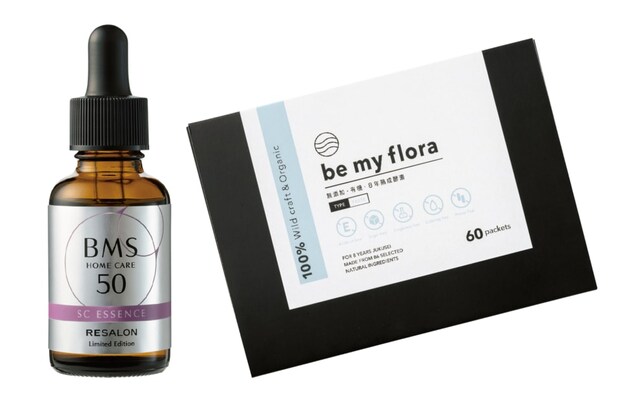 左:エイジングケア効果の高い成分を凝縮した、肌を育てることに特化した導入美容液。BMSホームケア SCエッセンス50 30mL ¥35,000、下:編集部にも愛飲者多数。be my flora 8年熟成酵素 60包 ¥19,500(共にREBEAUTY)