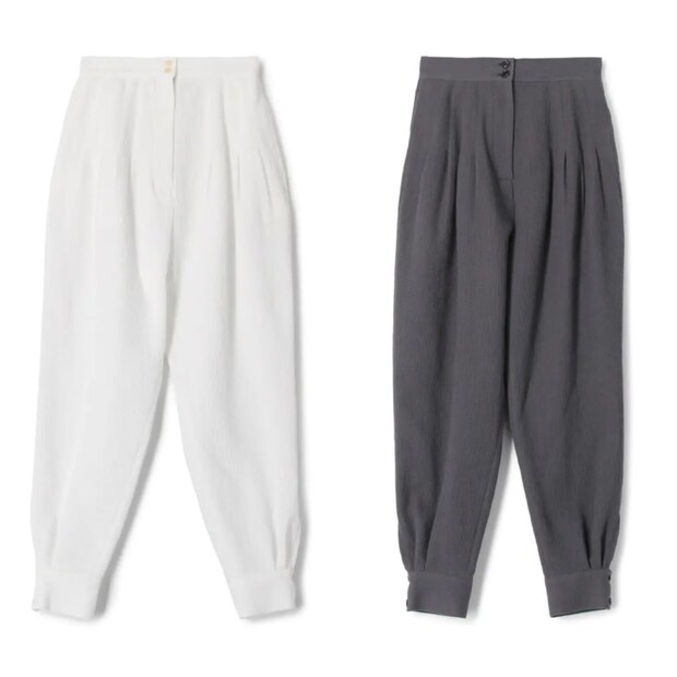 良質なタオルの生産地で有名な今治産のオリジナルワッフルクロスを使用した、優しい肌触りのパンツ。大城さんのはいているホワイトと、チャコールの2色展開。パンツ各¥23,100(共にバッカ/トゥモローランド)