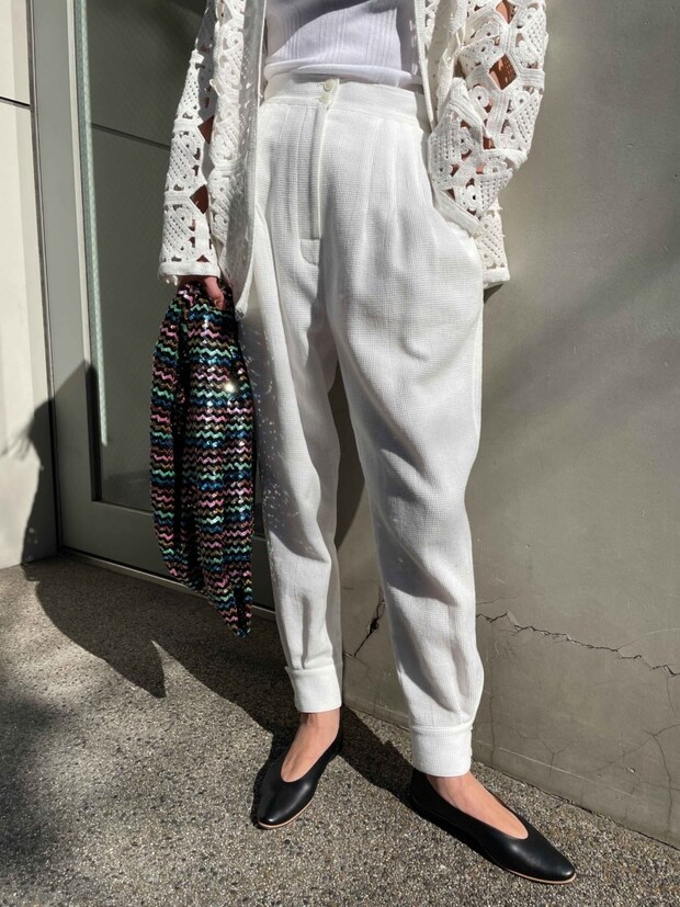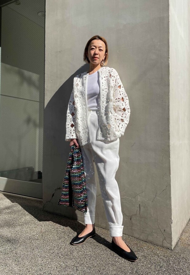 「春夏シーズンに着るモノトーンのスタイリングが好きです。トレンドのクロシェ風ジャケットにワッフル素材のパンツを合わせ、ホワイトのワントーンでまとめながら、素材感の違いを楽しみました。アシシュのスパンコールバッグで遊びをプラス。メリハリのある着こなしに」
