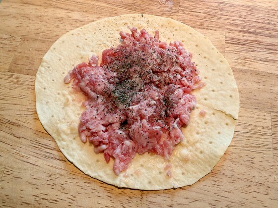 生地の上に生のひき肉を薄く広げて押し付け、塩こしょうを振ります。