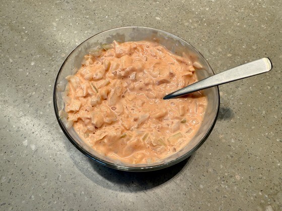 みじん切りにした玉ねぎを5分ほど水にさらし、水気をしっかり切ったら、マヨネーズ・ケチャップ・中濃ソース・にんにくチューブを加えてよく混ぜ合わせたら完成です。