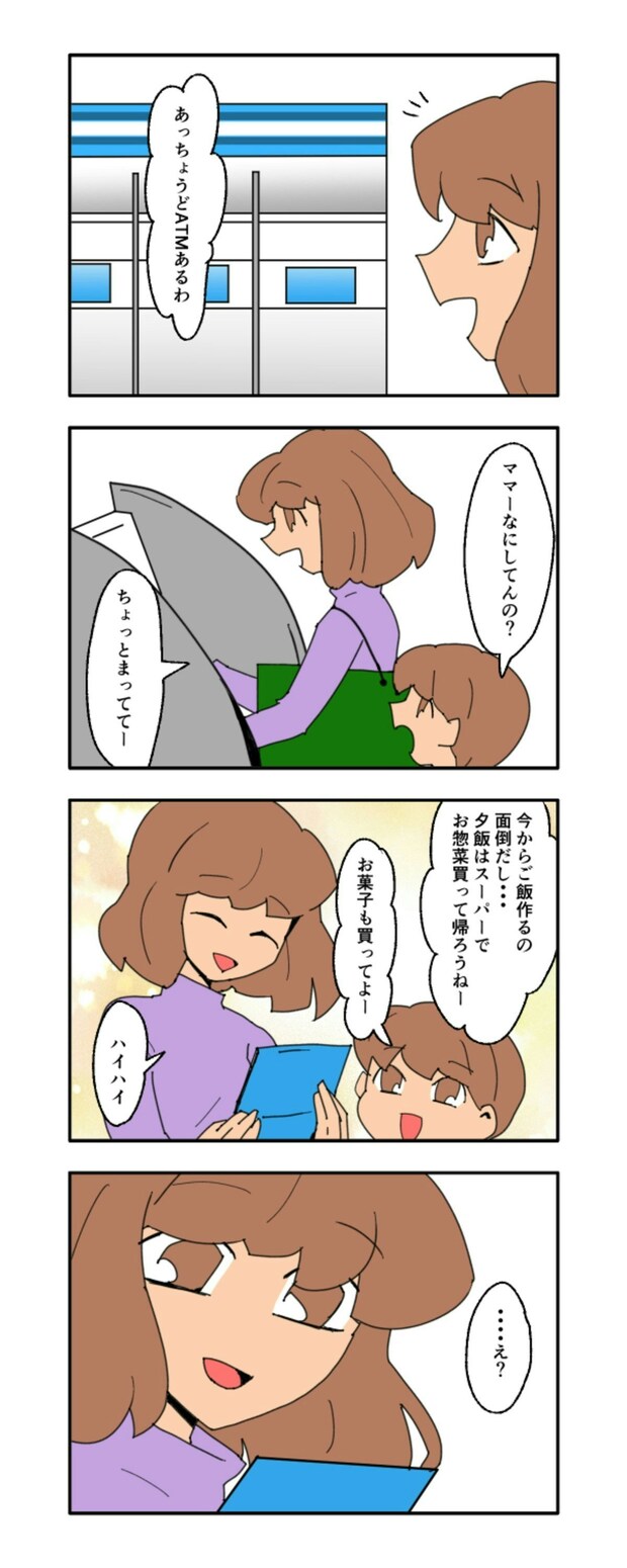 ハルミは小山さんと一緒にショッピングをして、とても楽しい時間を過ごしたようです。帰り道には、たまたまATMを見かけたため、久しぶりに通帳記入も行いました。