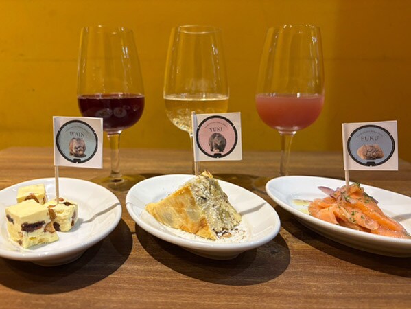 「ウォンバットコラボPOPUP限定マリアージュセット」1,500円(税込)は、伊丹空港内醸造ワインや自社ワイナリーのワインが飲み比べでき、ワインに合わせたミニ前菜が3種ついた人気のマリアージュセットの期間限定コラボバージョン。マンホールデザインの「ワイン」「フク」「ユキ」の旗をあしらって提供される。