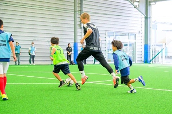 子どもたちは、ドリブルやパスなどの基本的な練習から実践的なミニゲームまで、プロの第一線で活躍した森﨑さんや中島さんをはじめとしたコーチたちから熱い指導を受けた。