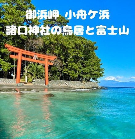 1番のおすすめスポットが御浜岬と諸口神社。御浜岬の小舟ケ浜では透き通った海と富士山の眺めを楽しむことができる。