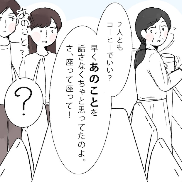 「2人ともコーヒーでいい?早く『あのこと』を話さなくちゃと思ってたのよ。さ、座って座って!」と素早くコーヒーを淹れてくれました。そんなに急いで何事かと思っていると、