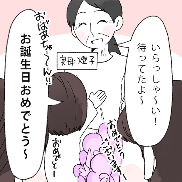 「いらっしゃ~い!待ってたよ~」と笑顔で出迎えてくれるお母さんに、「おばあちゃ~ん!!お誕生日おめでとう~」とののがお祝いすると、