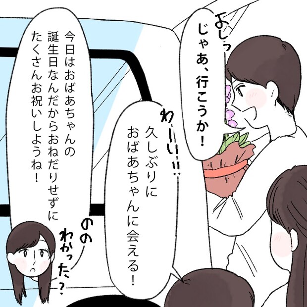 無事プレゼントのお花を買い、「よしっ!じゃあ行こうか!」海斗がそう言うと、「わーい!!久しぶりにおばあちゃんに会える!」とののもわくわく。「今日はおばあちゃんの誕生日なんだから、おねだりせずにたくさんお祝いしようね!ののわかった?」と私はののに言い聞かせました。
