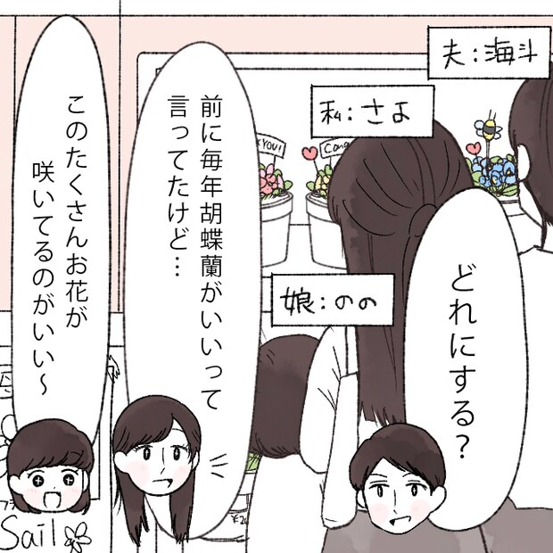 「どれにする?」海斗の言葉に、「前に毎年胡蝶蘭がいいって言ってたけど・・」私がそう答えると、「このたくさんお花が咲いてるのがいい~」とののが言いました。