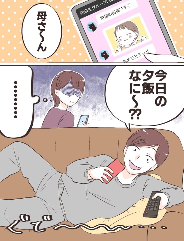 「待望の初孫です!」「おめでとう~!!」同級生とのグループチャットに書き込まれた初孫誕生の文字をじっと見つめるお母さん。その横では、「母さ~ん。今日の夕飯なに~??」ソファに寝っ転がりスマホ片手にテレビのリモコンを操る息子。お母さんは無言で恨めしそうに見つめるのでした。