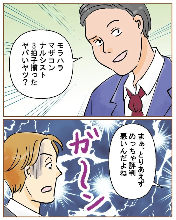「モラハラ・マザコン・ナルシスト3拍子揃ったヤバいヤツ?」そう言った後、「まぁ、とりあえずめっちゃ評判悪いんだよね」同期の言葉にがーン・・とツカサさんはショックを受けました。
