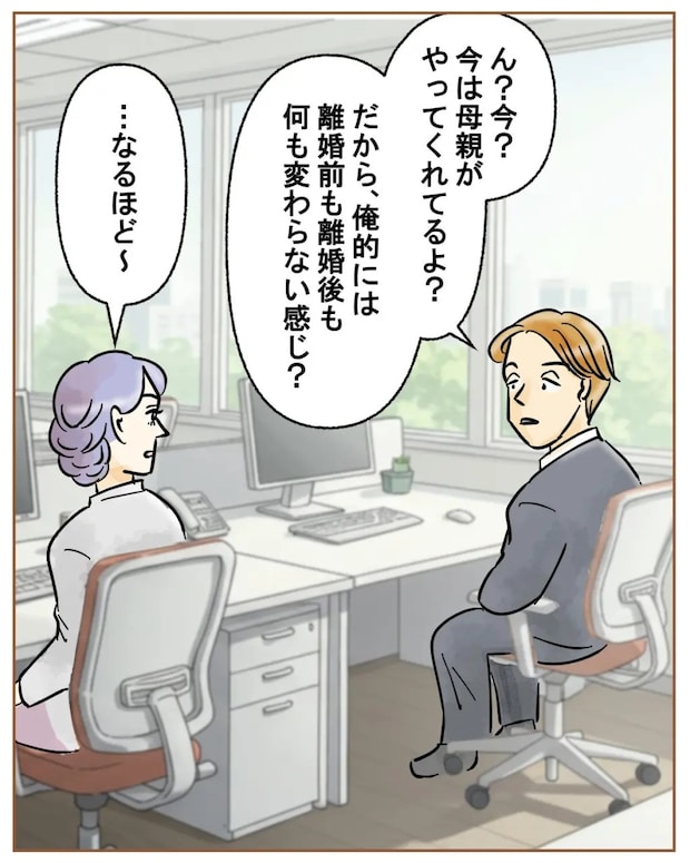 「奥さんがまだ自分のこと好きだって思ってるの痛いね」女性社員同士でお茶を飲みながら話しているのはツカサさんの離婚のこと。「今、お母さんが全部面倒見てくれてるんだって。モラマザじゃない?」と言うと、「ナルも入ってるしね。怖い怖い」と言い合いました。