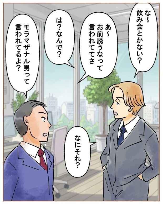 「な~飲み会とかない?」ツカサさんがそう言うと、「あ~、お前誘うなって言われててさ」同期の社員にそう言われ、「は?なんで?」とたずねると、「『モラマザナル男』って言われてるよ?」と言われ、「なにそれ?」と聞き返すと、
