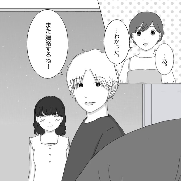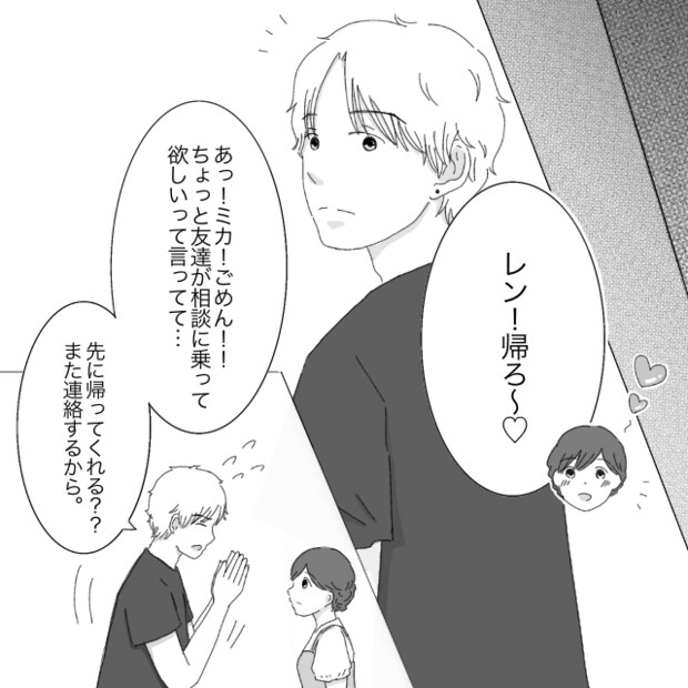 「また連絡するね!」と言うレンの背後には、さっきレンと仲良さそうに話していた女の子の姿が・・・。相談に乗ってほしいって、その女の子と2人きりで過ごすってこと?喉まで出かかった言葉を飲み込んで、「わかった」とレンを送り出しました。