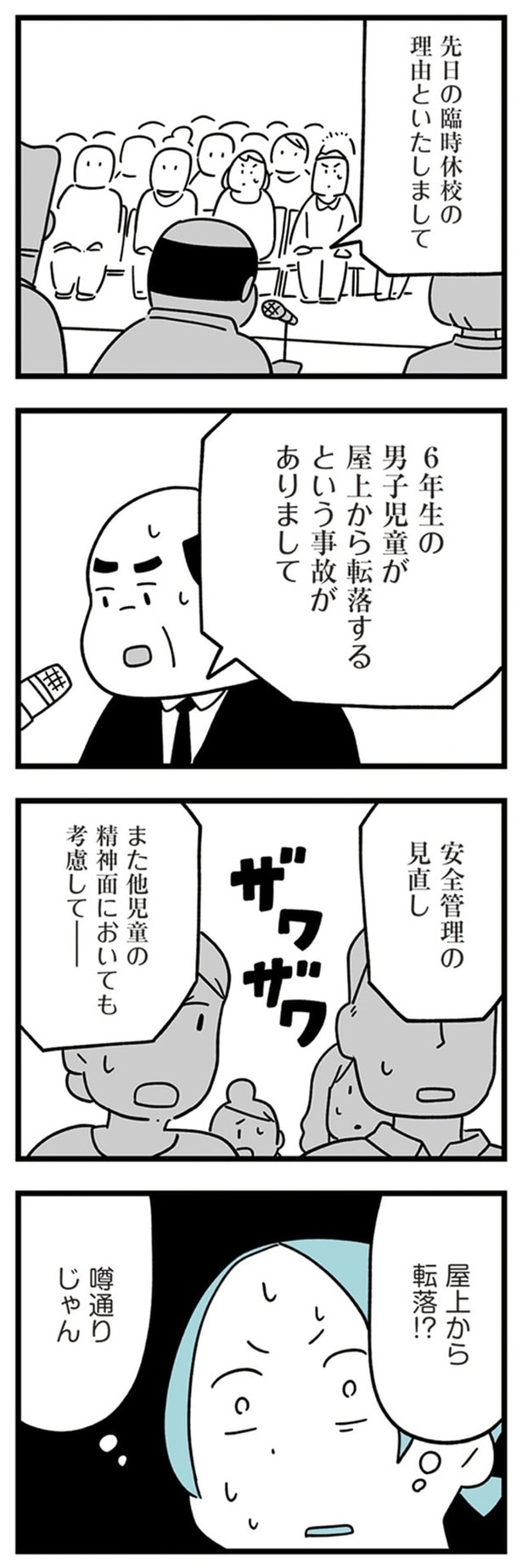 前回、学校で緊急の保護者会が開かれることになった。そして、保護者会に参加した茜の母・翼は、“男子児童が屋上から転落する事故があった”と説明を受ける。学校はいじめの可能性も含めて調査に乗り出すことになり…。