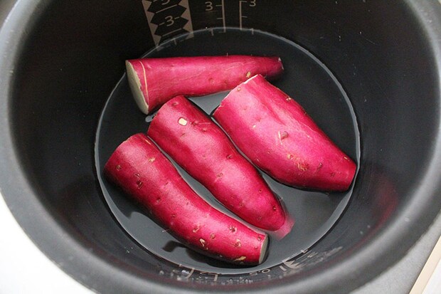 綺麗に洗ったさつまいもを炊飯器に入れ、さつまいもが半分浸るくらいの水を入れます。あとは、炊飯のスイッチを押すだけ。さつまいもが長くて入りきらない場合は、包丁でカットしましょう。