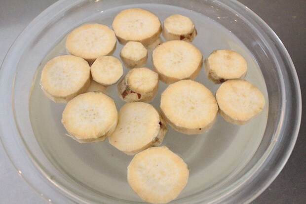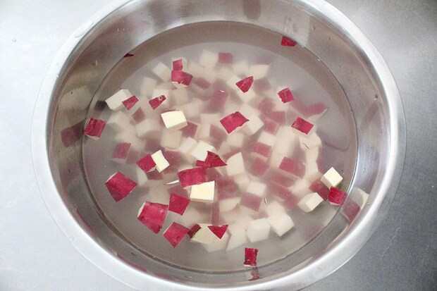 1. さつまいもを1cm幅に切って、10〜15分ほど水にさらしてアク抜きをする。
