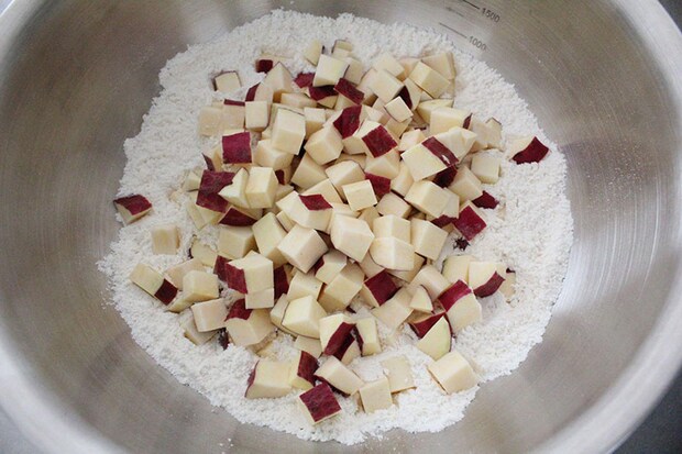 2. ホットケーキミックスに1のさつまいもを加える。