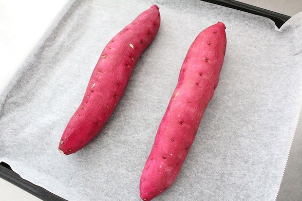 天板にクッキングシートを敷き、綺麗に洗って水気を切ったさつまいもを並べます。あとは、180℃(予熱なし)で1時間ほど焼けば完成。竹串がスッと通らない場合は、加熱時間を少しずつプラスします。
