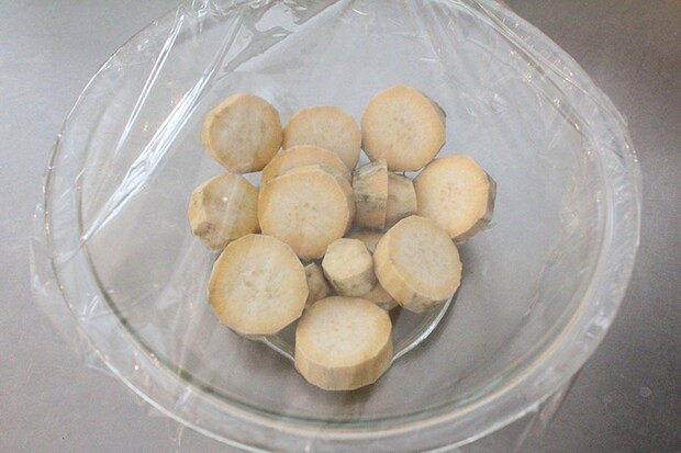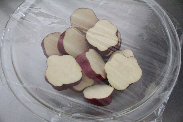 2. 耐熱ボウルにさつまいもを入れ、水を少量ふりかけ、ふんわりとラップをかける。600wで5分加熱する。