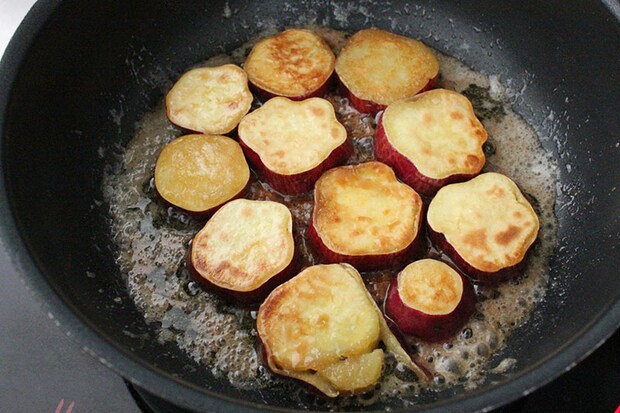 4. 3が完全に溶けきったら、水気を切ったさつまいもを投入。
