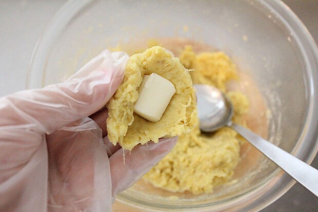5. 真ん中に好みのチーズを入れてしっかりと包み、丸く成形する。