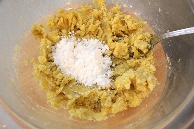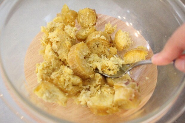 3. マッシャーやフォークでつぶす。ここで水分が足りないようであれば牛乳を、甘みが足りないようであれば砂糖を足す。