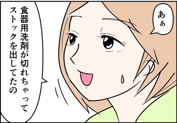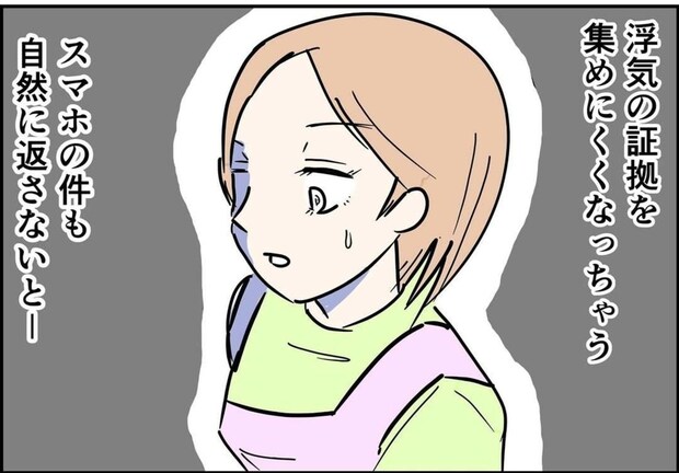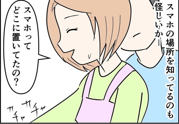 スマホを見られたと気づかれたら証拠集めにしようが出てしまうと焦る佳奈さん。洗面所にいた言い訳を一生懸命考えます。