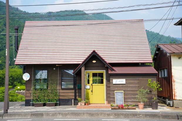 黄色いドアが目印のログハウス風の建物は、かわいらしくて思わず写真を撮りたくなる雰囲気♪