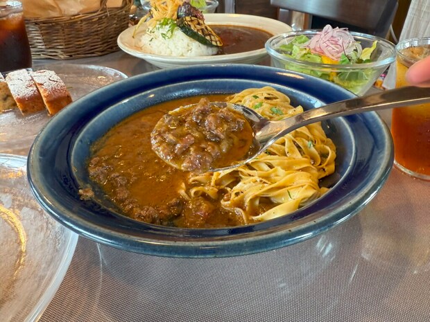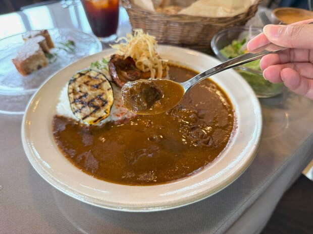 しばちゃんは「鹿すね肉のカレー」を注文。こちらもパン・サラダ・ドリンク付きで1200円、ケーキをセットにして1500円。