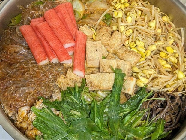お好みの具材例として「豚バラ肉・白菜・チンゲン菜・長ネギ・えのき・油揚げ・カニカマ・春雨」が書かれているので、ぜひ参考にしてください。
