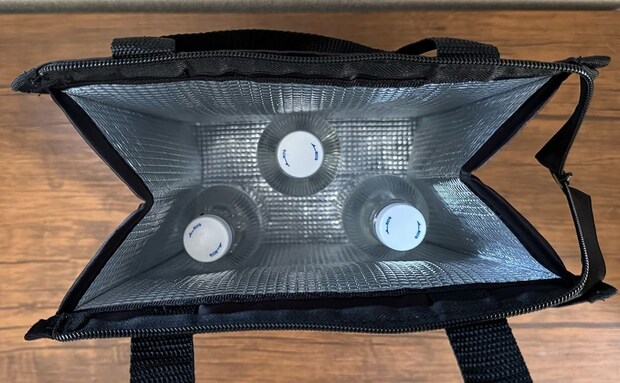 サイズは約縦35×横25×奥行き15cmで、持ち手は37.5cm。外装はポリエステル、内装はアルミ蒸着仕様の保冷バックです。