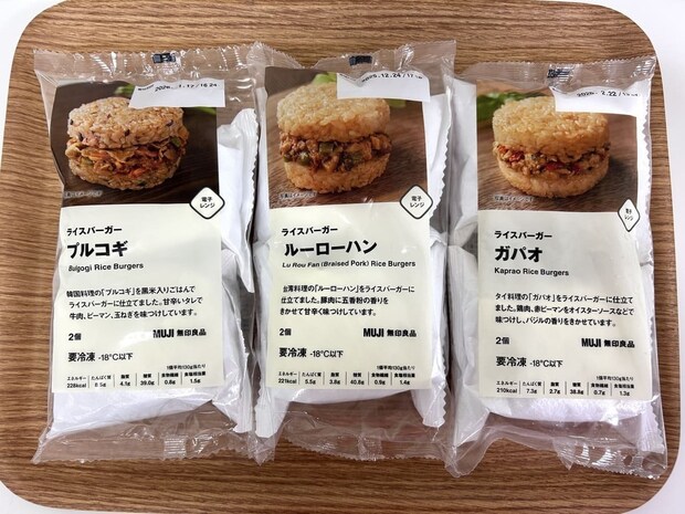 無印良品のエスニック系ライスバーガー3種。、ワンハンドで手軽に食べられる人気の商品です。