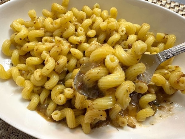 茹でたパスタにトマトソースを混ぜ、唐辛子とガーリックのトッピングをかけるだけで完成!