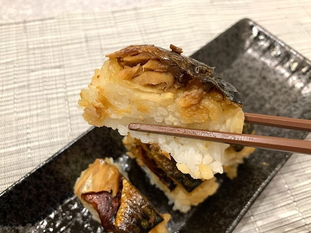 焼き鯖と酢飯の間には甘酢生姜が入っていて、シャキシャキ食感と甘味・酸味・辛味のバランスが良いアクセント。