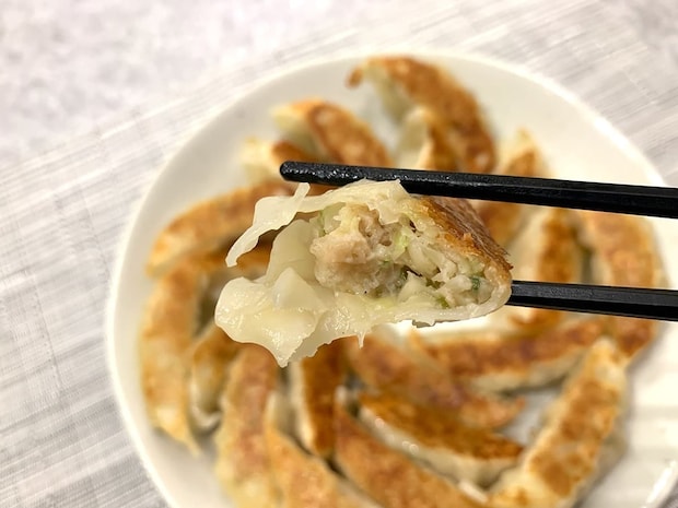 他のメーカーの冷凍餃子でもよく見るようなサイズ感で、キャベツの自然な甘みを軽い食感の餃子の皮で包んだ一品。