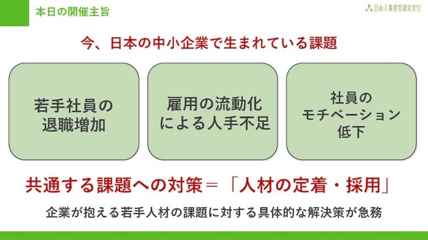 ラウンドテーブルの冒頭、山元氏は多くの中小企業が「若手社員(特にZ世代)の退職増加」「雇用の流動化による人手不足」「社員のモチベーション低下」という3つの大きな課題に直面していると指摘しました。