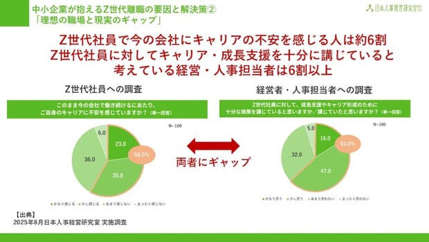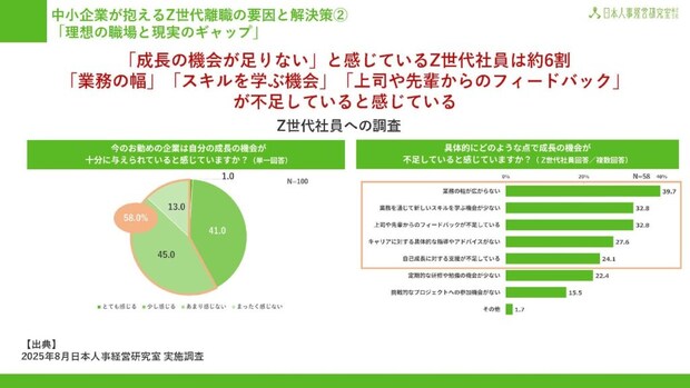 その理由として、「思い描いた業務内容と違った」に次いで、「成長機会がなかった」が多く挙げられました。さらに、約6割のZ世代が「今の会社では成長の機会が十分に与えられていない」と感じているというデータも示されました。