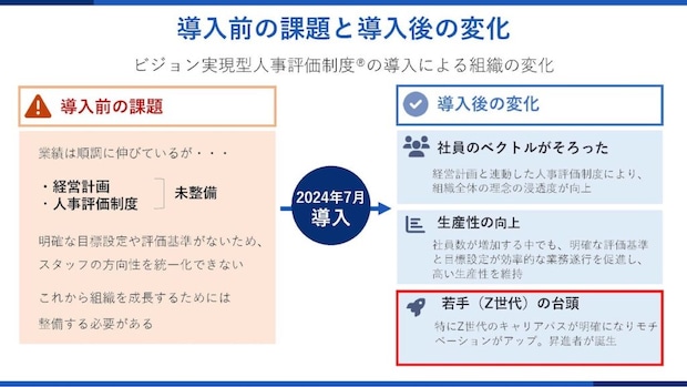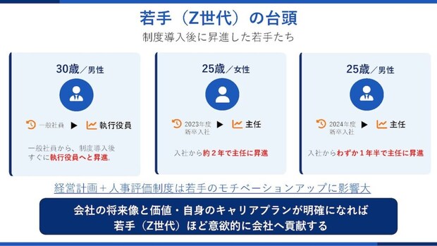 制度導入後、同社では社員のベクトルが揃い、生産性が向上。特に大きな変化として、小久保氏は「若手の台頭」を挙げます。