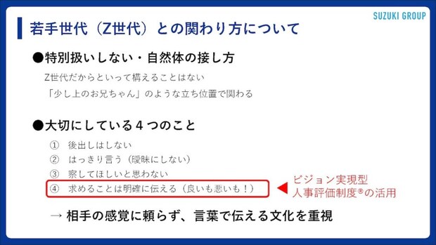 「Z世代だからと構えることはありません。ただし、『後出しはしない』『はっきり言う』『察してほしいと思わない』そして『求めることは明確に伝える』という4つのことを徹底しています。例えば、『始業10分前には来て準備をしてほしい』といったことも、曖昧にせず言葉でしっかり伝えます。人事評価制度は、単に評価をする場ではなく、社員に成長してほしいという思いを伝えるコミュニケーションの機会だと捉えています」(鈴木氏)