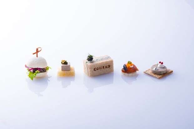左から「ローストビーフスライダー」、「栗と淡路島レモンのスパイスバター」、「キューカンバーサンドイッチ」、「竹炭塩でマリネしたサステナブルサーモン」、「平飼いチキンのムース」