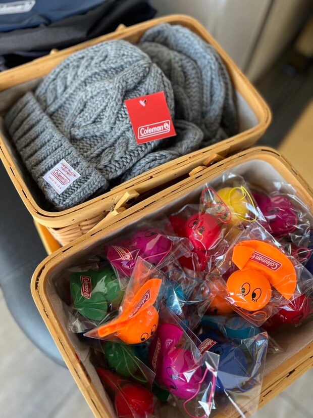 コールマンサンタからは、てるてる坊主のサンキャッチャーとニット帽を。