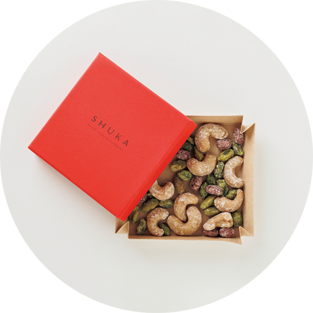 製法を追求し、素材の風味、形や色、食感までも残した甘納豆から進化した種の菓子。瑞穂大納言小豆・ピスタチオ・カシューナッツの3種入り。¥1,100/シュカ 住:京都市中京区壬生西大竹町3-1 ☎075-841-8844 営:11:00〜17:00(日曜は16:00まで) 休:月
