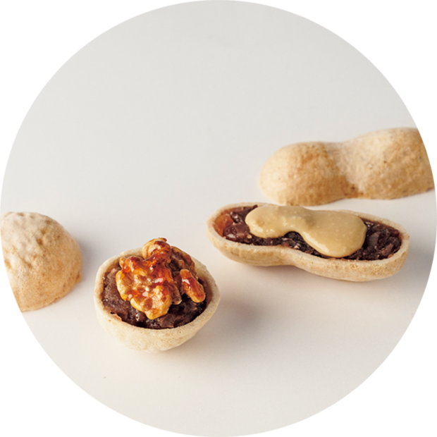 砕いたナッツを練り込んだ最中に餡とピーナッツバターやクルミを合わせたお菓子。落花生には自分で挟む「おもたせ種実」(12個入り ¥3,500)も。各¥250/たねかしょうてん 住:京都市中京区車屋町通二条下ル仁王門突抜町317 ☎075-201-3016 営:11:00〜17:00 休:木金土