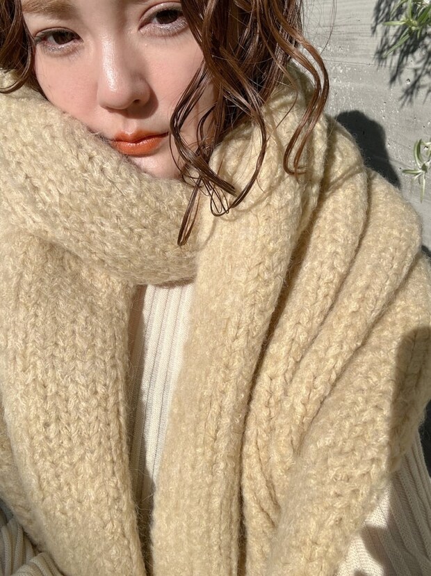 「秋から冬、冬から春に変わる一瞬にしかできないけど、コートを着ずにストール×ニットが最高に好きな組み合わせです。ストールでたるんだフェイスラインを隠せるのも、助かります(笑)。ボリューミーなアイテムを使っているので上半身はコンパクトに。これを巻いておけばとりあえず可愛いと信じています」