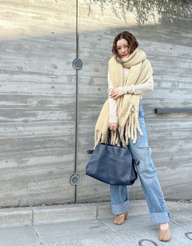 TODAYFULのストール、uncraveのニット、Maison Margielaのデニムとブーツ、THE ROWのバッグは本人私物