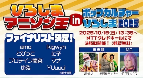 19日の13:35からは、「ひろしまアニソン王グランプリ決定戦」を開催。観覧は無料だ。予選を勝ち残った8人が、グランプリを目指してアニメソングを熱唱し競う。MCに歌手の竹下ひかり氏、審査員にはコスプレイヤーの亀仙人氏や、音楽ユニットのお局様ディナーを迎える。