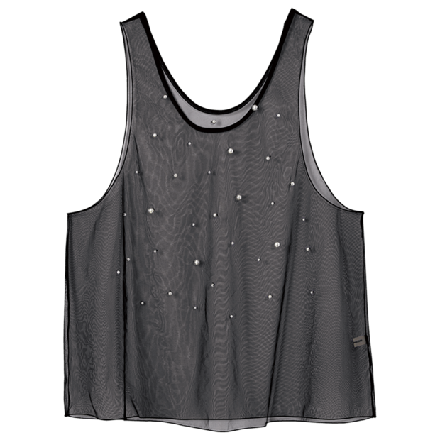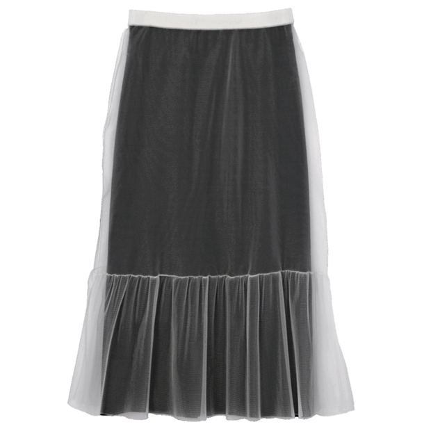 黒地にシアーな白を重ねたスカートは、スタイリング次第で甘口にもモードにも。振り幅広く楽しめる。