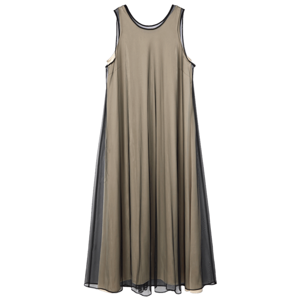 サテン×薄手チュールの異素材レイヤードが贅沢。それぞれ単品でも使え、手持ちアイテムとのアレンジにも重宝。